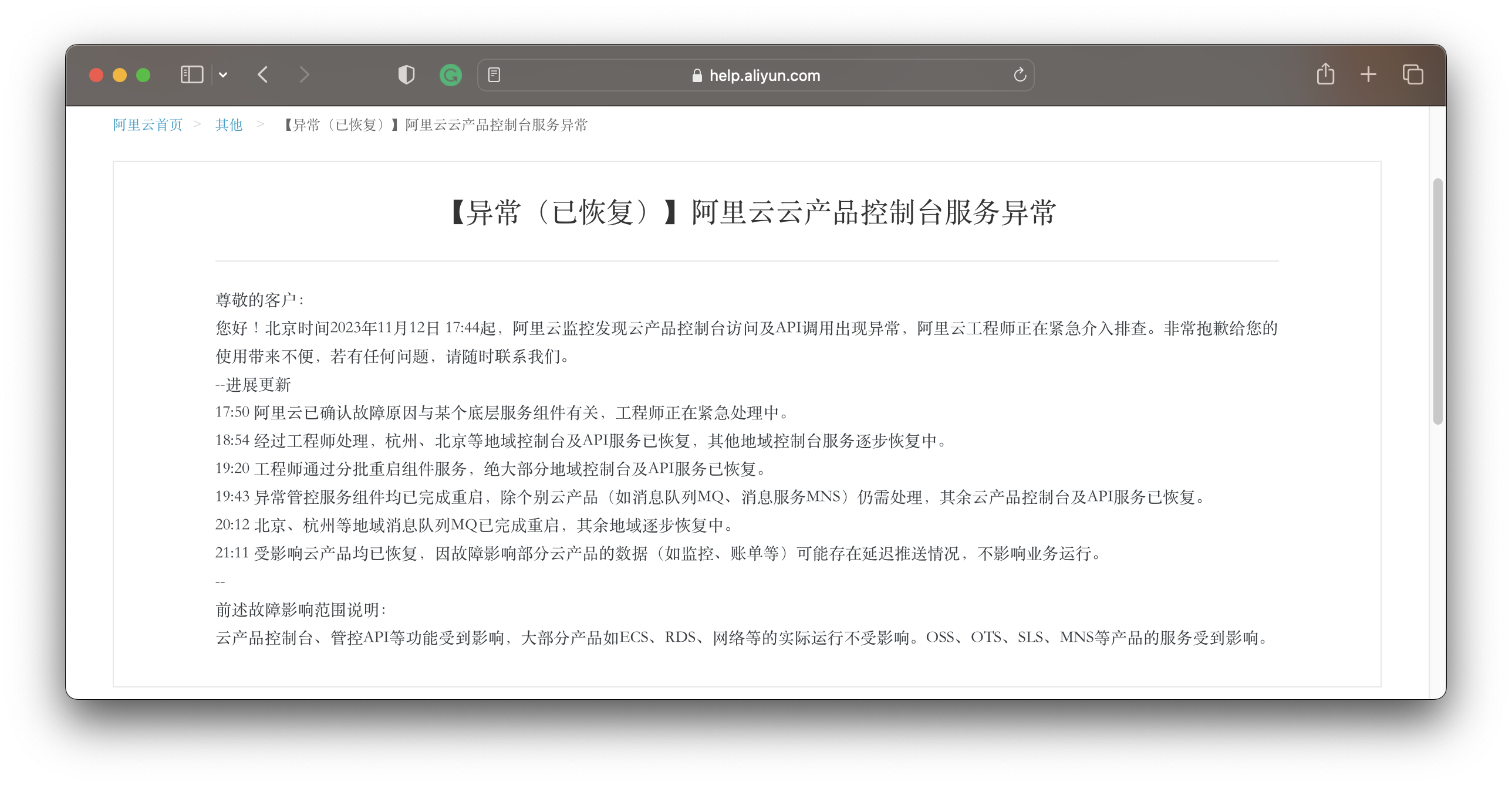 “云产品控制台、管控API等功能受到影响,OSS、OTS、SLS、MNS等产品的服务受到影响,大部分产品如ECS、RDS、网络等的实际运行不受影响”。