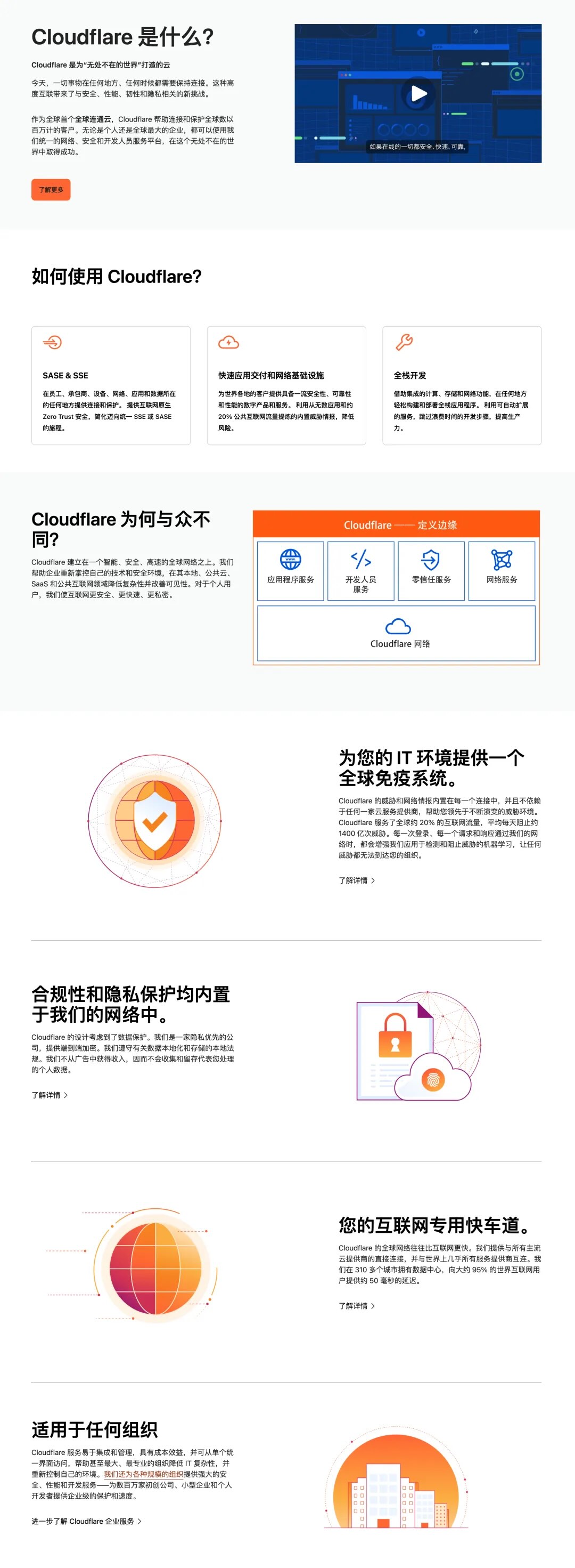 Cloudflare是一家提供内容分发网络(CDN)、互联网安全性、抗DDoS(分布式拒绝服务)和分布式DNS服务的美国公司。全世界互联网流量的 20% 由它服务。如果你挂着 VPN 访问一些网站,经常可以看到 Cloudflare 的抗 DDoS 验证码页面和 Logo。他们提供: