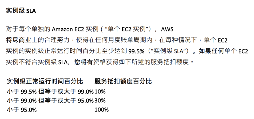 以业界标杆 AWS 为例,AWS 大部分服务使用类似的 SLA 模板3。AWS 上的单个虚拟机提供以下 SLA【4】。这意味着在最好情况下,如果 AWS 上EC2 一个月内不可用时间在 21 分钟内(99.9%),AWS 一分钱不赔。在最坏情况下,只有当不可用时间超过36小时(95%),您才能获得 100% 的代金券返还。
