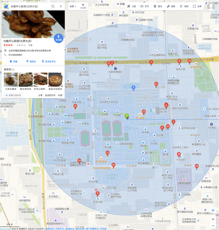给定的示例中心店:北京师范大学,116.3660 E, 39.9615 N。
