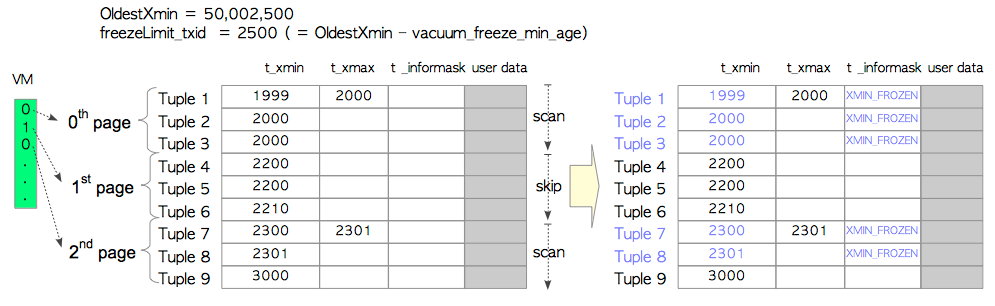 图6.6给出了一个例子。 根据VM中的信息,冻结此表时会跳过第0页。在更新完1号页面后,相关的VM信息会被更新,因为该页中所有的元组都已经被冻结了。