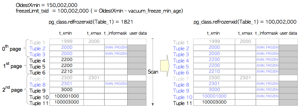 t_xmin值都小于freezeLimit_txid。此外,因为Tuple_1是一条死元组,因而在该清理过程中被移除。 -