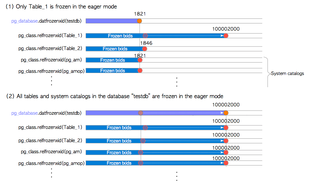 冻结一张表后,目标表的pg_class.relfrozenxid将被更新。 pg_class是一个系统视图,每个pg_class.relfrozenxid列都保存着相应表的最近冻结的事务标识。本例中表1的pg_class.relfrozenxid会被更新为当前的freezeLimit_txid(即100,002,000),这意味着表1中t_xmin小于100,002,000的所有元组都已被冻结。
