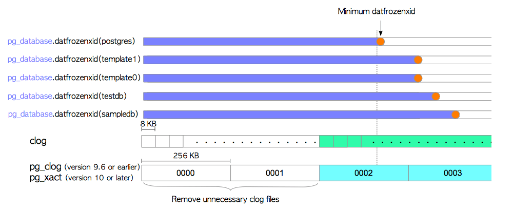 图6.7给出了一个例子。 如果clog文件0002中包含最小的pg_database.datfrozenxid,则可以删除旧文件(0000和0001),因为存储在这些文件中的所有事务在整个数据库集簇中已经被视为冻结了。