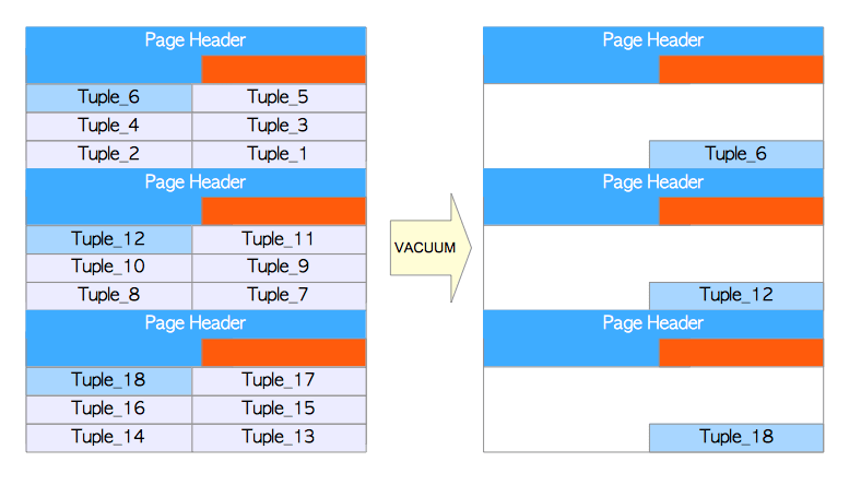 - 移除每一页中的死元组,并对每一页内的活元组进行碎片整理。