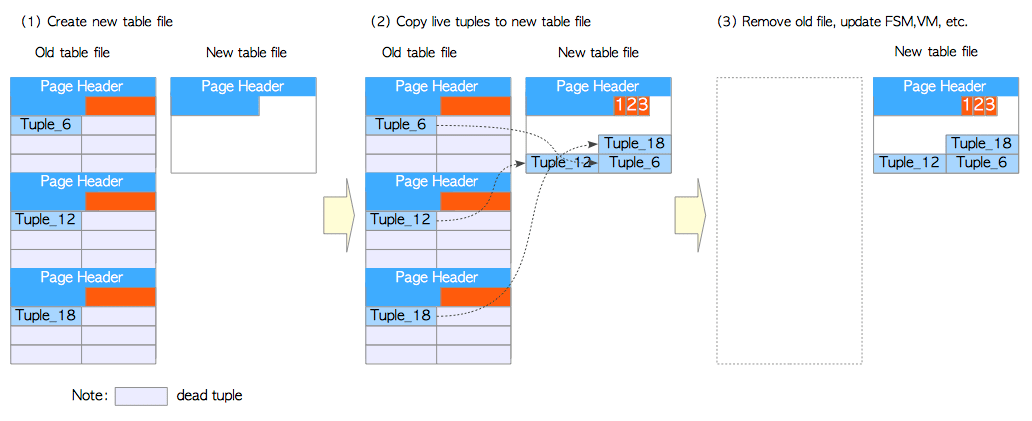 (1) FOR each table (2) 获取表上的AccessExclusiveLock锁 (3) 创建一个新的表文件 (4) FOR 每个活元组 in 老表 (5) 将活元组拷贝到新表中 (6) 如果有必要,冻结该元组。 END FOR (7) 移除旧的表文件 (8) 重建所有索引 (9) 更新FSM与VM (10) 更新统计信息 释放AccessExclusiveLock锁 END FOR (11) 移除不必要的clog文件