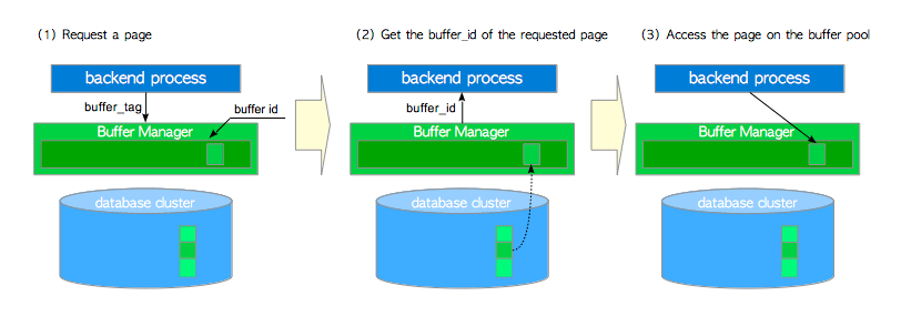 - 当读取表或索引页时,后端进程向缓冲区管理器发送请求,请求中带有目标页面的