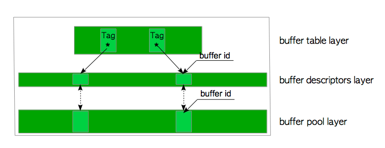 **缓冲表(buffer table)**层是一个哈希表,它存储着页面的