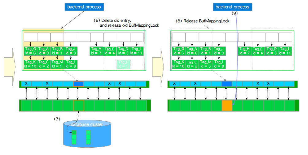 buffer_id的旧表项,并在缓冲区描述符层将受害者槽位的缓冲区描述符钉住。本例中受害者槽的buffer_id=5,旧表项为Tag_F, id = 5。时钟扫描将在下一节中介绍。 -