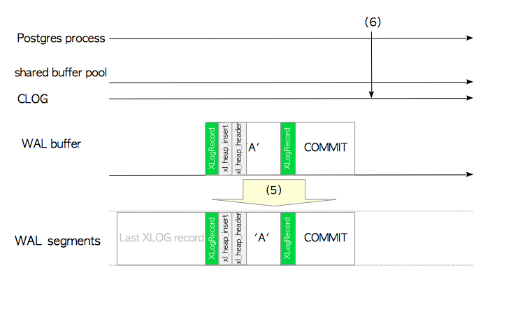 INSERT语句进行插入操作时,PostgreSQL执行的操作几乎同上所述。区别在于这里的XLOG记录是当前页的备份区块(即,包含了完整的页面),因为这是自最近一次检查点以来,该页面的第一次写入。 - 当事务提交时,PostgreSQL的操作同上节所述。