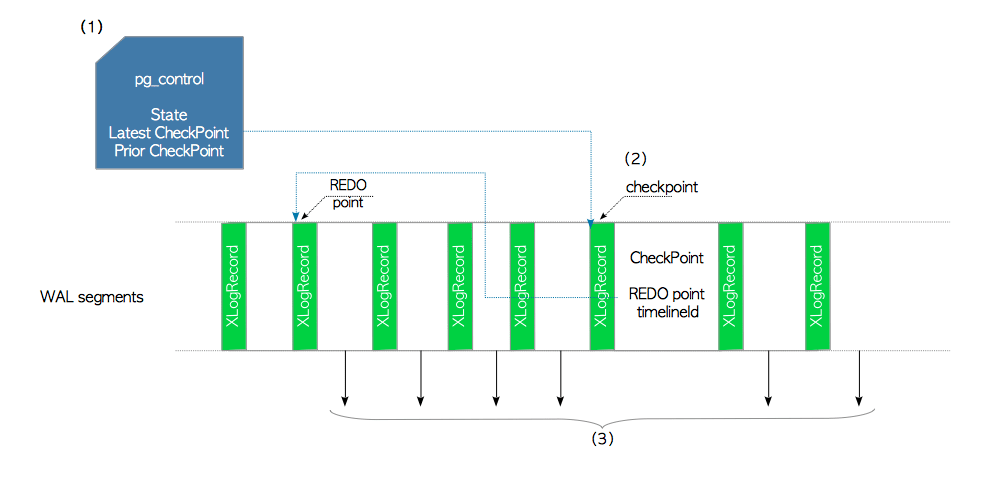 让我们从数据库恢复的角度来总结上面的内容,检查点过程会创建包含重做点的检查点,并将检查点位置与其他信息存储到pg_control文件中。因此,PostgreSQL能够通过从重做点回放WAL数据来进行恢复(重做点是从检查点中获取的)。
