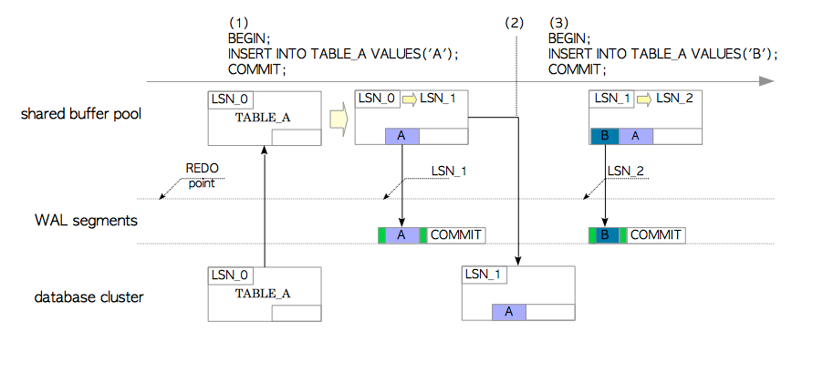 INSERT语句时,PostgreSQL从数据库集簇文件中加载表A的页面至内存中的共享缓冲池,向页面中插入一条元组,然后在LSN_1位置创建并写入一条相应的XLOG记录,然后将表A的LSN从LSN_0更新为LSN_1。在本例中,XLOG记录是由首部数据与完整元组组成的一对值。 - 当该事务提交时,PostgreSQL向WAL缓冲区创建并写入一条关于该提交行为的XLOG记录,然后将WAL缓冲区中的所有XLOG记录刷写入WAL段文件中。