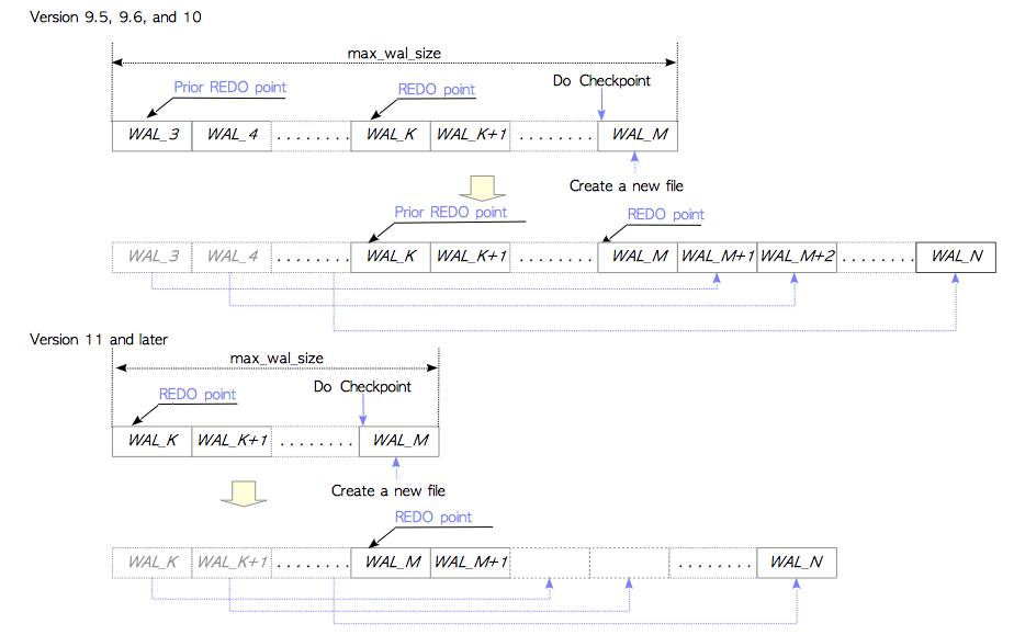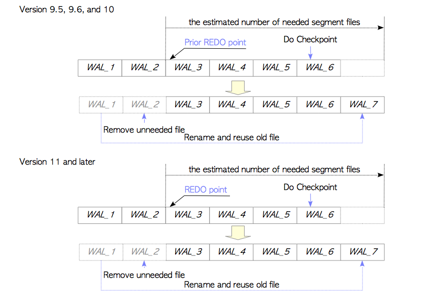 PostgreSQL 11及后续版本只会存储包含最新检查点或更新版本的WAL段文件;将不会存储包含先前检查点的旧段文件,以减少用于在