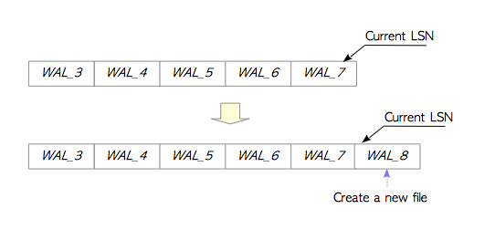 PostgreSQL将XLOG记录写入pg_xlog子目录中的WAL段文件中(版本10之后是pg_wal子目录),当旧的段文件写满时就会切换至新的段文件。WAL文件的数量会根据几个配置参数的变化而变化,一些服务器的行为也会相应变化。此外,在9.5版中,段文件的管理机制也有了一些改善。