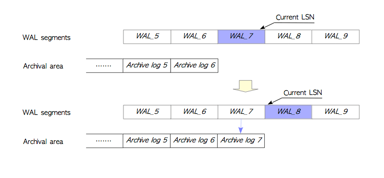 当WAL段文件WAL_7发生切换时,该文件被拷贝至归档区域,作为归档日志7。