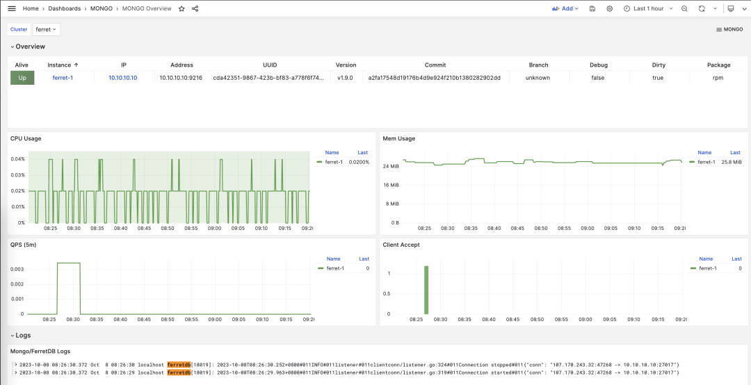 这个监控面板提供了关于 FerretDB 的基本监控指标,因为 FerretDB 底层使用了 PostgreSQL,所以更多的监控指标,还请参考 PostgreSQL 本身的监控。