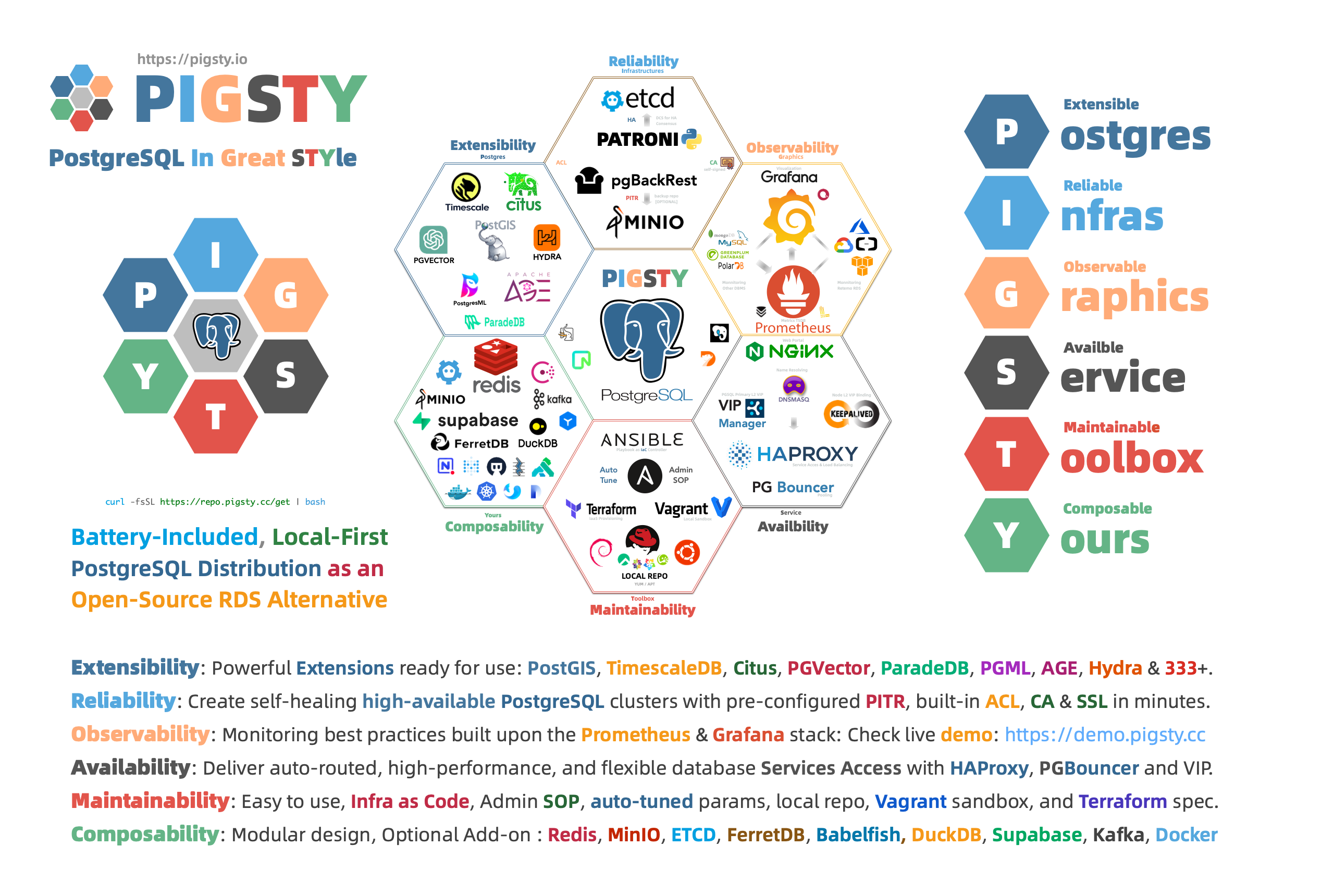 所以我打造了 Pigsty —— 一个开箱即用的开源 PostgreSQL 数据库发行版,旨在凝聚 PostgreSQL 生态扩展的合力,并把提供优质数据库服务的能力普及到每个用户手中。