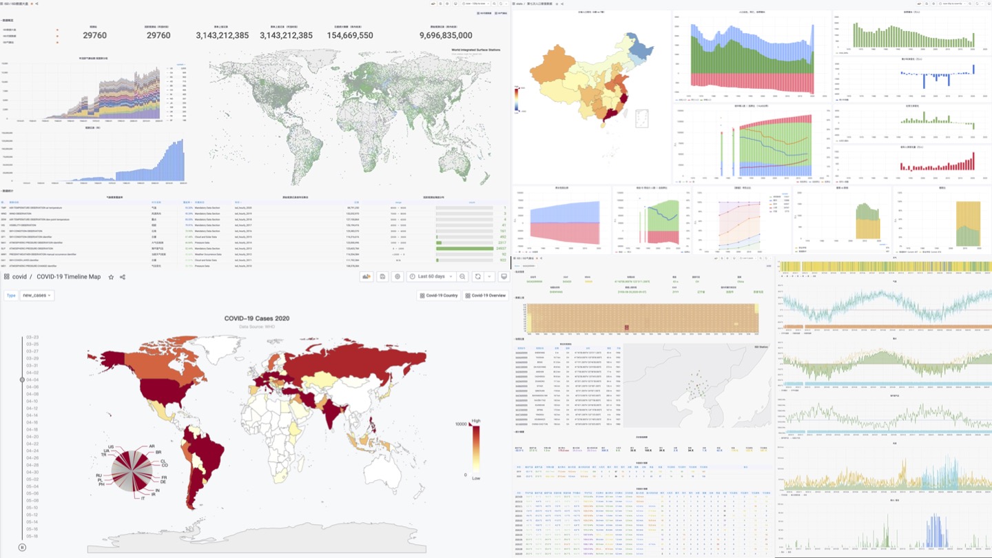 Pigsty集成了Echarts,以及常用地图底图等,可以方便地实现高级可视化需求。比起Julia,Matlab,R这样的传统科学计算语言/绘图库而言,PG + Grafana + Echarts的组合允许您以极低的成本制作出可分享,可交付,标准化的数据应用或可视化作品。