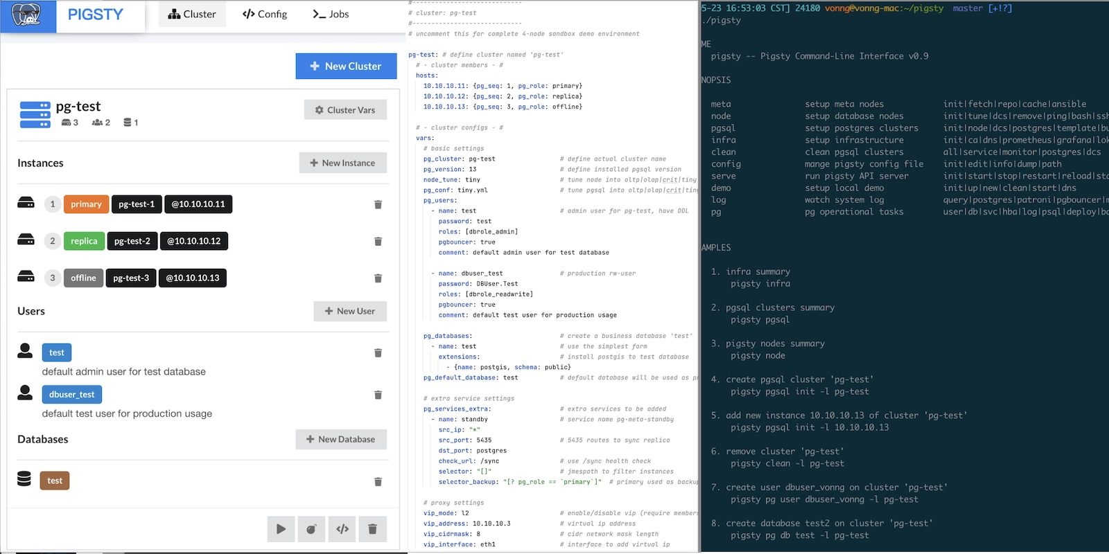Pigsty内置了一套以Ansible为核心的数据库管控方案。并基于此封装了命令行工具与图形界面。它集成了数据库管理中的核心功能:包括数据库集群的创建,销毁,扩缩容;用户、数据库、服务的创建等。Pigsty采纳“Infra as Code”的设计哲学使用了声明式配置,通过大量可选的配置选项对数据库与运行环境进行描述与定制,并通过幂等的预置剧本自动创建所需的数据库集群,提供近似私有云般的使用体验。