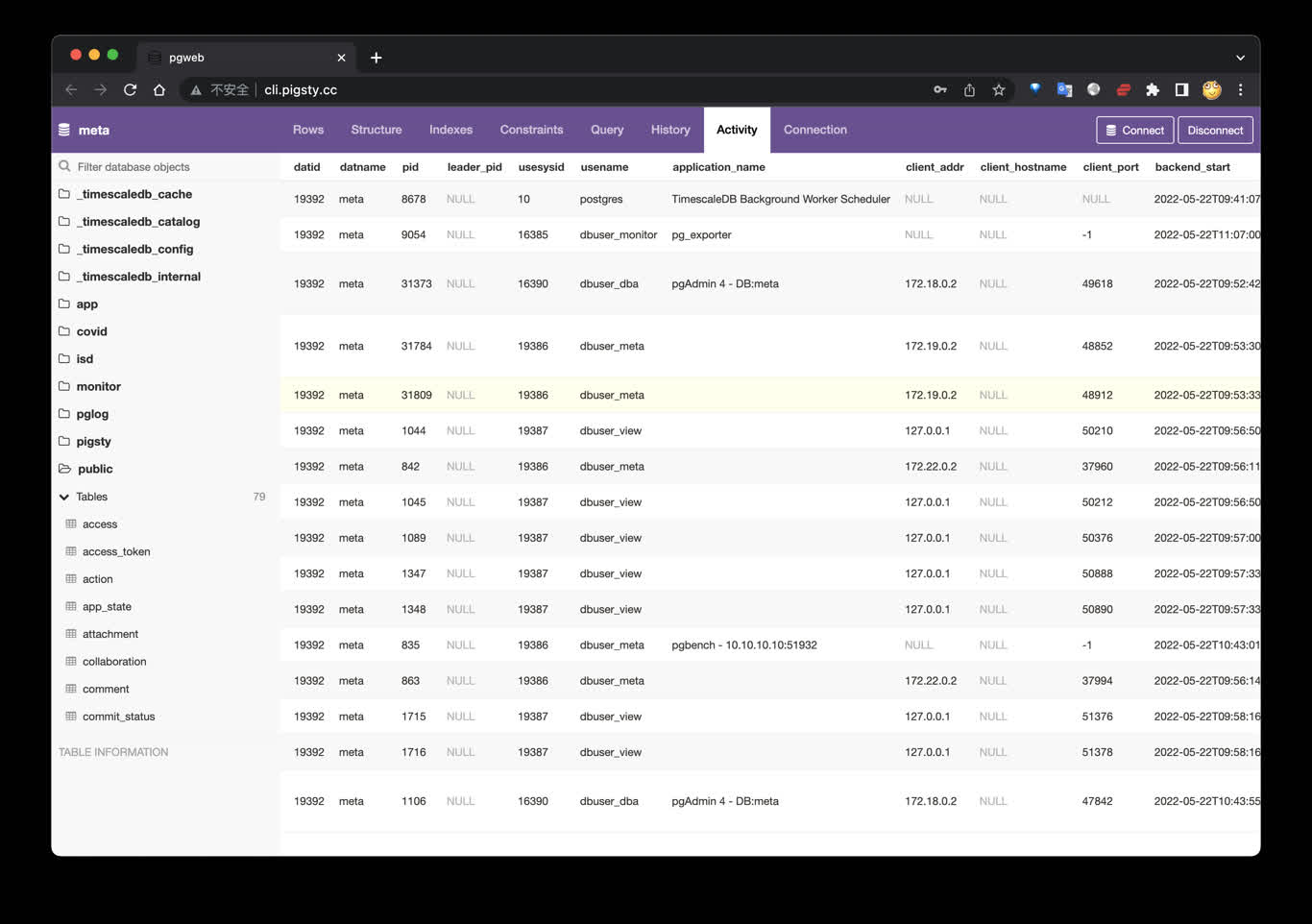您可以尝试使用下面的URL连接串,通过 PGWEB 连接至数据库实例并进行探索。