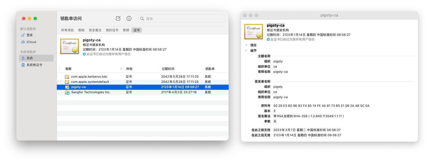 /usr/sbin/update-ca-certificates在 MacOS 上,您需要双击 ca.crt 文件将其加入系统钥匙串,然后在钥匙串应用中,搜索 pigsty-ca ,打开然后选择 “信任” 此根证书。
